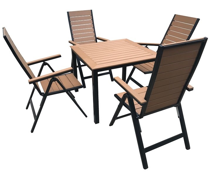 Pohodlný nábytok pre Váš relax na záhrade. Konštrukcia je z ľahkého hliníka. Na dosku stola a stoličky je použitý kompozitný materiál na báze polypropylénu plneného drevnými časticami, ktorý zaistí Vášmu nábytku stály vzhľad a minimálnu údržbu. Nábytok je veľmi odolný poveternostným vplyvom a UV žiareniu. Jedná sa o výbornú imitácii dreva vo farbe teaku.