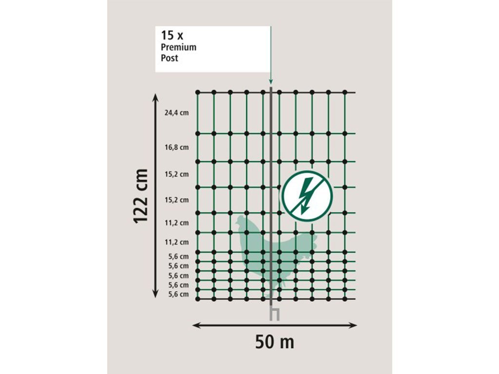 Ohradníková nevodivá sieť pre hydinu PREMIUM s výškou 122 cm a dĺžkou 50 m. Súčasťou balenia je 15 extrémne odolných stĺpikov s dvojitým pozinkovaným hrotom, ktoré zaisťujú vysokú stabilitu výbehu. Vďaka obzvlášť malej veľkosti ôk v spodnej časti, je sieť vhodná pre kuracie alebo jahňatá aj kurčatá.