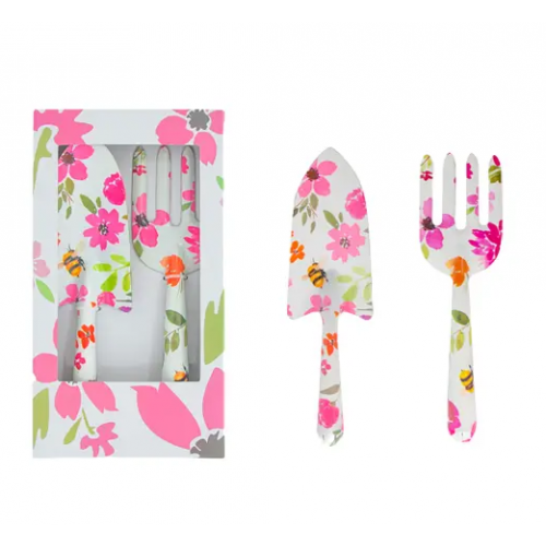 Stylové ruční nářadí s květinovým motivem, balené v krabičce.
