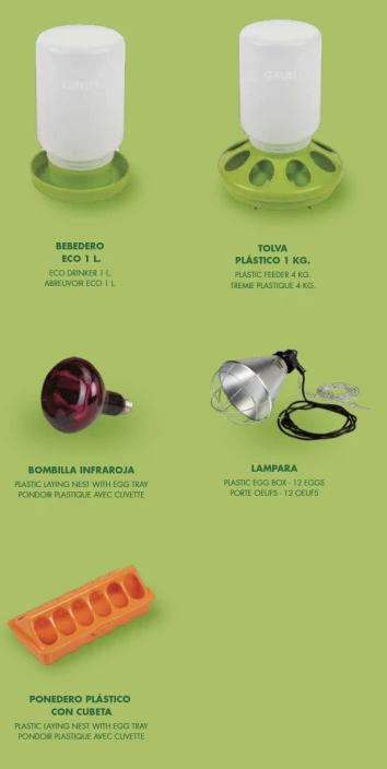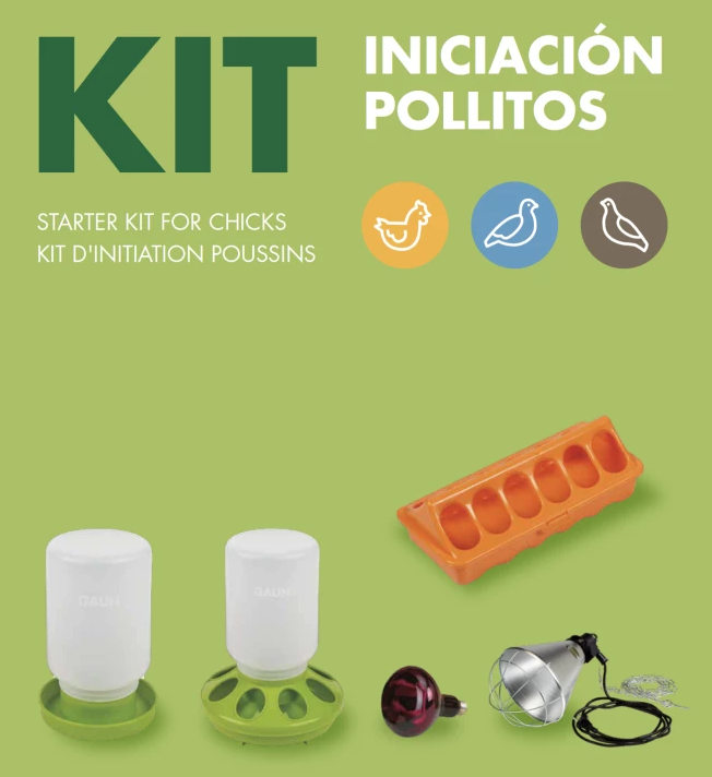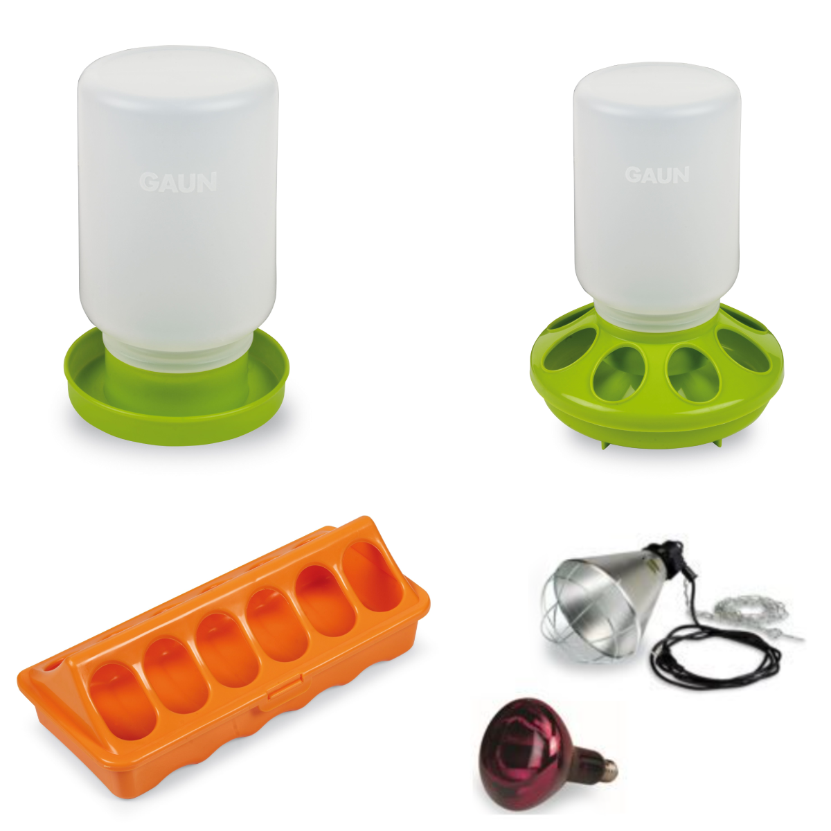Základná sada na odchov hydiny, ktorá obsahuje 2x kŕmidlo, napájačku, lampu a žiarovku.