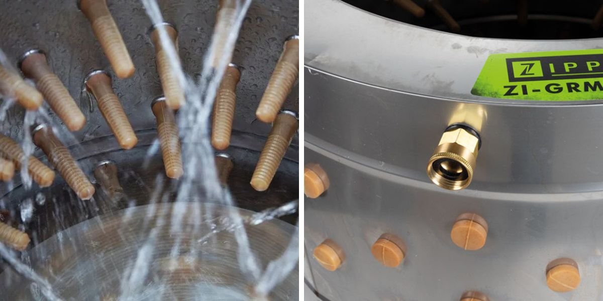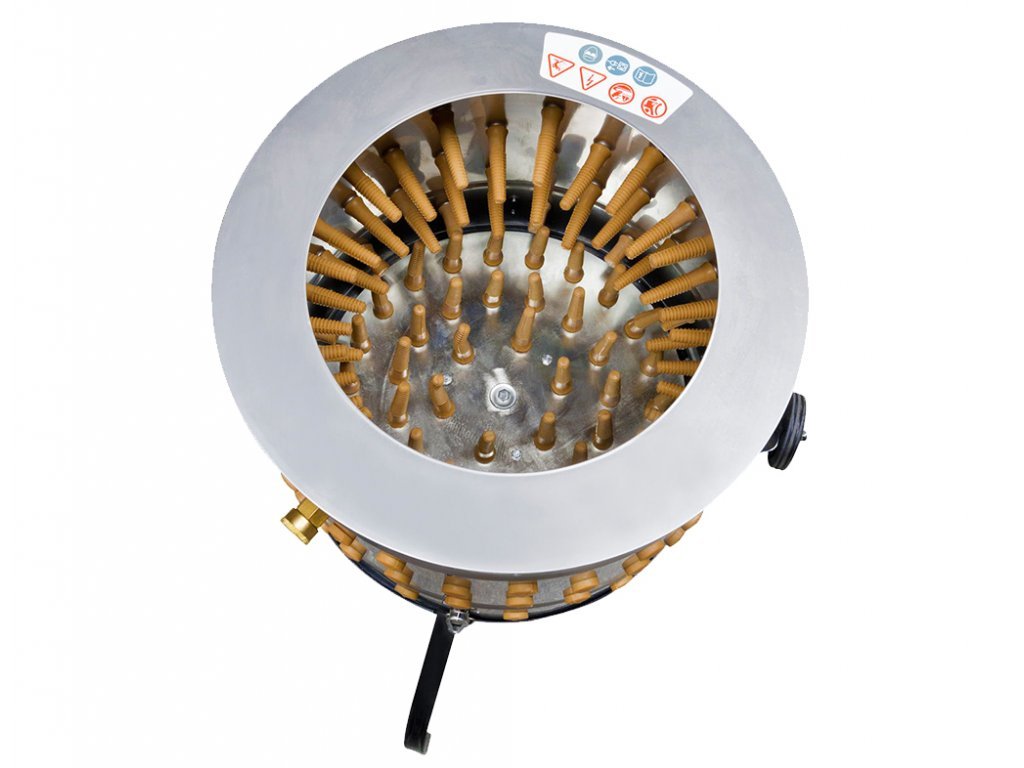 Táto nerezová šklbačka obsahuje oplachový kruh pod horným okrajom. Obsluha šklbačky sa tak stáva ešte jednoduchšou a Vy nemusíte počas šklbania stáť pri šklbačke a oplachovať perie. Môžete tak vykonávať iné činnosti, alebo si predpripraviť ďalšiu hydinu na šklbanie, zatiaľ čo oplachový systém šklbačky urobí prácu za Vás. Oplachovanie počas šklbania nielenže zbaví šklbanú hydinu nečistôt, ale tiež zefektívňuje celé šklbanie, predchádza sa potrhaniu kože a mokré perie sa lepšie ošklbe. Jednoducho pripojíte hadicu na ventil šklbačky, pustíte vodu a môžete šklbať.