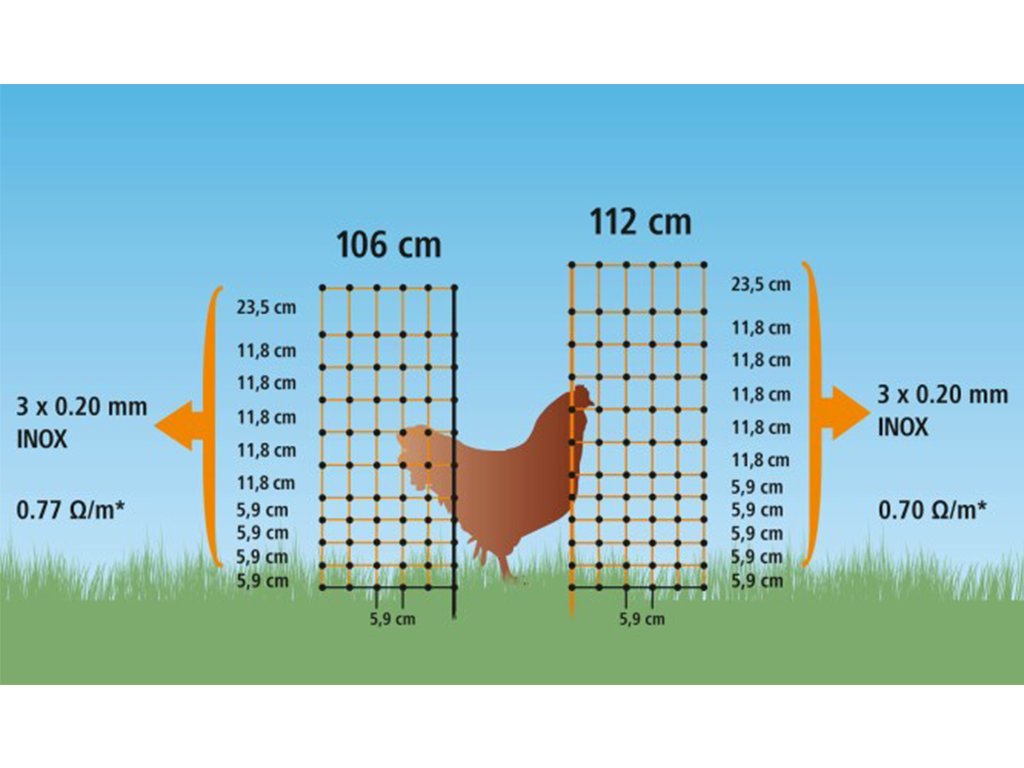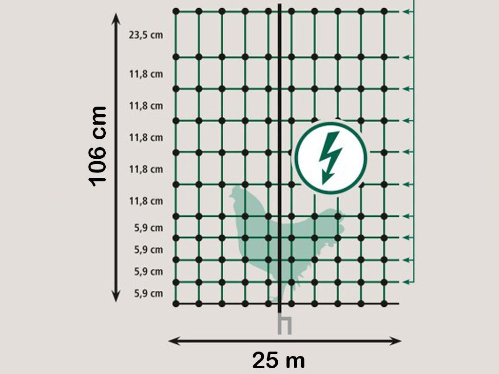 Ohradníková vodivá sieť pre hydinu s výškou 106 cm a dĺžkou 25 m, vhodná na konštrukciu elektrického ohradníka. Súčasťou balenia je 9 pevných plastových tyčiek s dvojitým hrotom a 4 kotviace háky. Jedná sa o ochrannú sieť, ktorá zamedzí úniku sliepok či jahniat a zároveň ich ochráni pred predátormi.