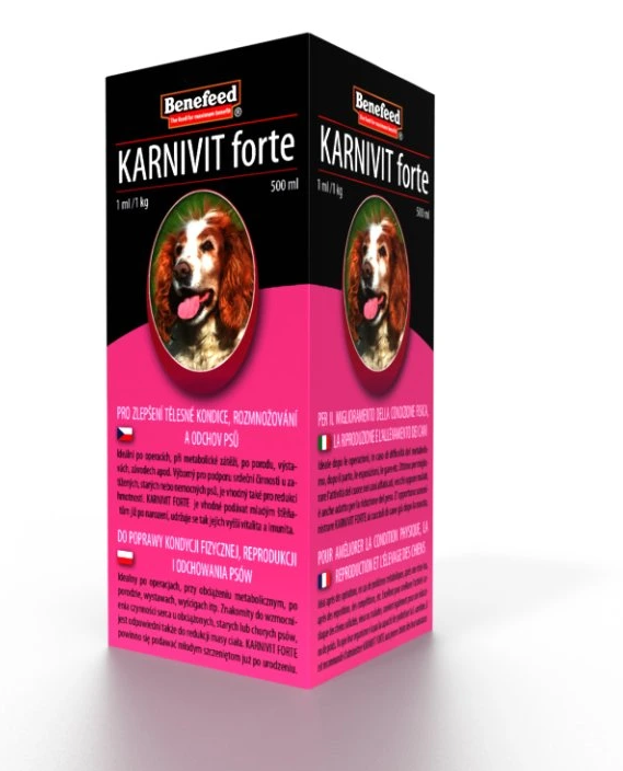 KARNIVIT FORTE obsahuje špecifický komplex látok zlepšujúcich reprodukciu psov vo Vašom chove. Všetky aktívne látky sú vo forme, ktorá zaistí maximálnu účinnosť každej z nich.