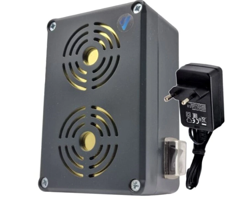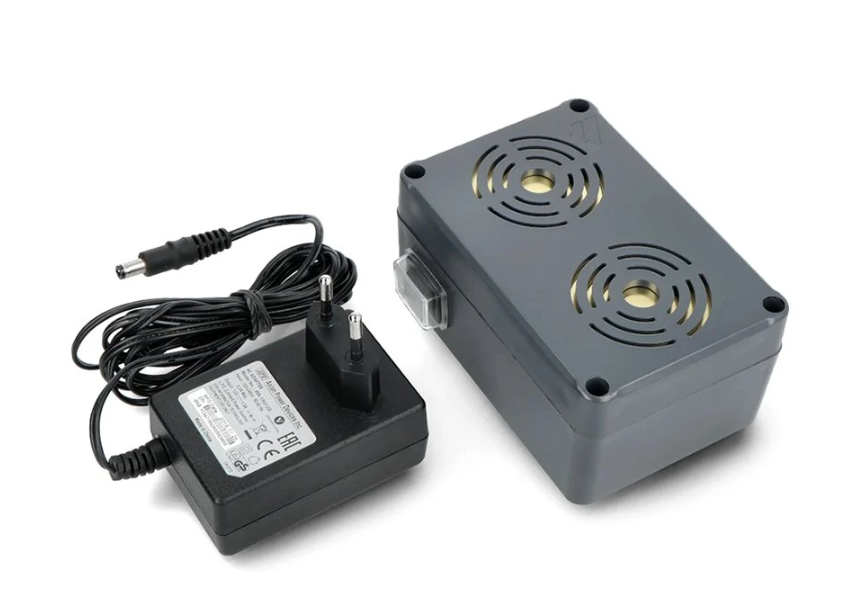 Zariadenie je napájané cez 12V adaptér, ktorý je súčasťou balenia. Odpudzovač disponuje praktickým vypínačom v ochrannom puzdre, vďaka ktorému ho môžete jednoducho vypnúť a zapnúť bez nutnosti vypojiť adaptér zo siete.