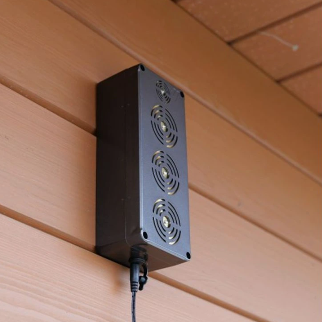Zariadenie je napájané cez 12V adaptér, ktorý je súčasťou balenia. Odpudzovač disponuje praktickým vypínačom v ochrannom puzdre, vďaka ktorému môžete jednoducho vypnúť a zapnúť stroboskopické LED svetlá.