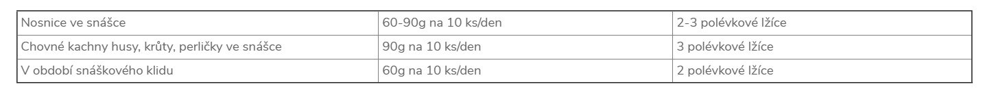 Minerálne krmivo sa pridáva do bežnej kŕmnej dávky hydiny, ktorá tvorí prevažne obilný šrot a neposkytuje hydine plnohodnotnú výživu. Takto optimalizovaná kŕmna zmes prispieva k nutričnému vyváženiu krmiva s ohľadom na potrebu živín, zlepšuje využitie prijatého krmiva, podporuje dobrý zdravotný stav hydiny, napomáha zvyšovať znášku a podporuje oplodnenosť a liahnivosť vajec. Minerálne krmivo je vyrábané z kvalitných surovín v Českej republike a neobsahuje žiadne geneticky modifikované suroviny.