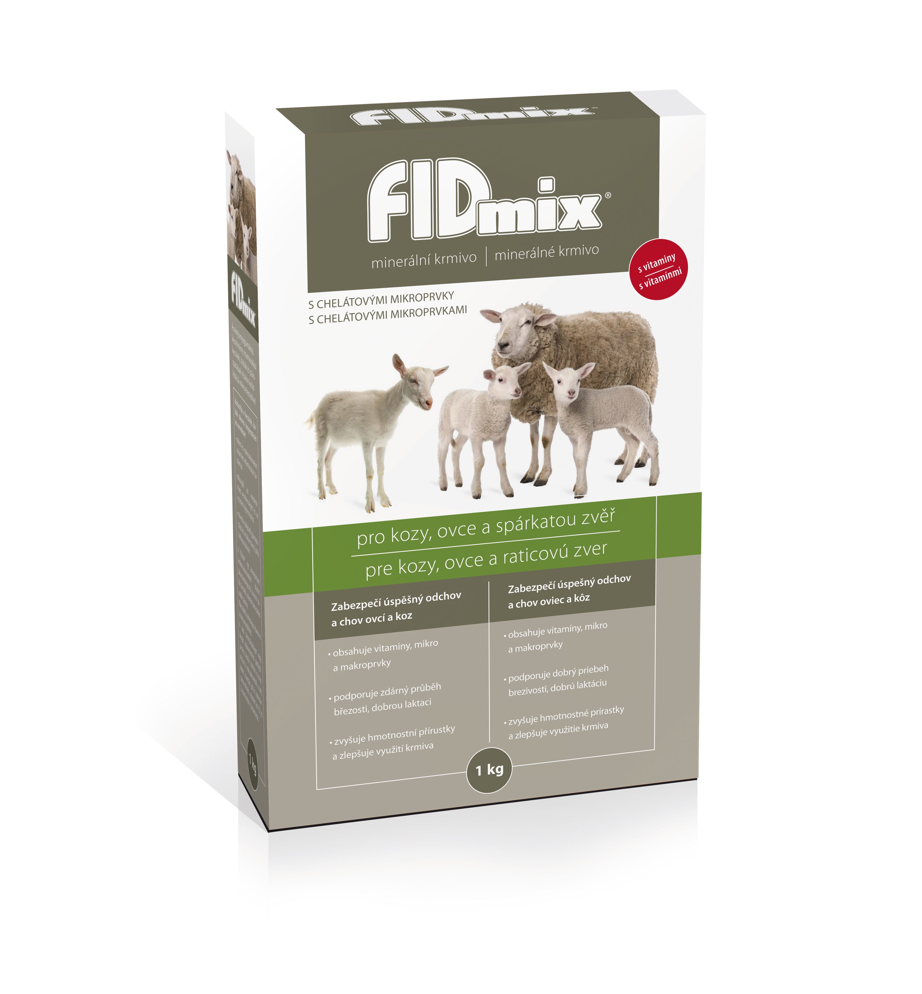 FIDmix® umožňuje vyrovnať nedostatok minerálnych látok a vitamínov v kŕmnych dávkach malých prežúvavcov: oviec, kôz a škárovanej zveri. zinok, kobalt, mangán, jód a selén. FIDmix® tiež obsahuje vitamíny A, D3 a E, chránené účinnou obdukciou.