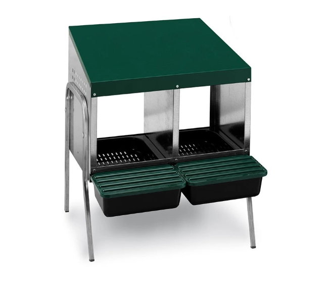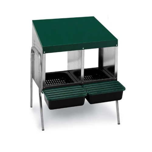 Znáškové hniezdo pre sliepky so zberným košom pre dvojmiestne na nožičkách zabraňuje rozbitiu a znečisteniu vajec, keďže dno znáškového hniezda je vyspádované. Po znáške sa vajíčka následne zrolujú do nádoby, z ktorej čisté a nepoškodené vajíčka jednoducho vyberiete. Bočné panely a strecha sú vyrobené z pozinkovanej ocele pre stabilnú a odolnú konštrukciu v zostave a vaničky sú vyrobené z plastu. Rolovací dizajn pomáha chrániť vajíčka pred poškodením. Nádoby na košíky na vajíčka majú vetranie. Vďaka zbernej tácke odoberiete vajíčka rýchlo, jednoducho a predovšetkým čisto. Tento model je vybavený kovovými nohami, ktoré umožňujú flexibilitu pri montáži hniezda. Hlavné výhody - odolnosť, praktickosť, zberná miska, zabraňuje sliepke klovať vajíčka, jednoduchá montáž.