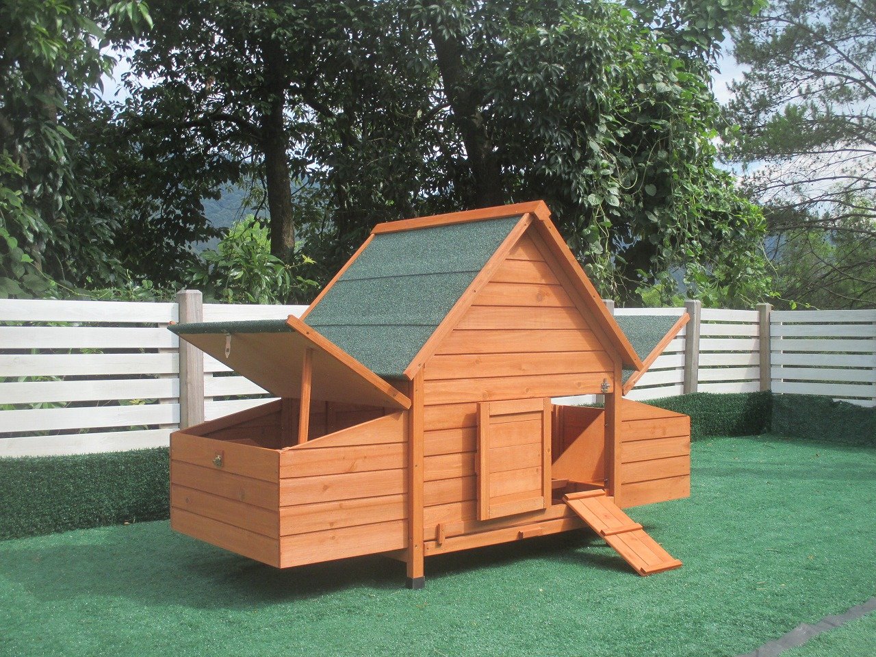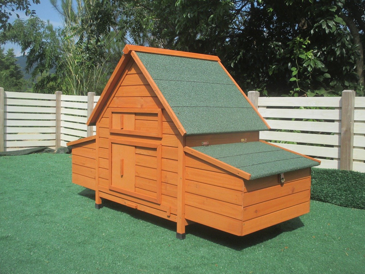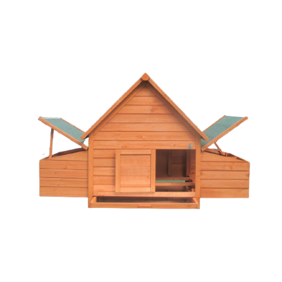 Celé vnútro kurníka je dokonale chránené pred dažďom, vetrom a chladom. Drevené nohy sú chránené pred poveternostnými vplyvmi plastovými krytmi. Pred dažďom chráni celý kurník strecha z asfaltového pásu.