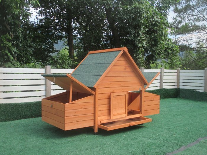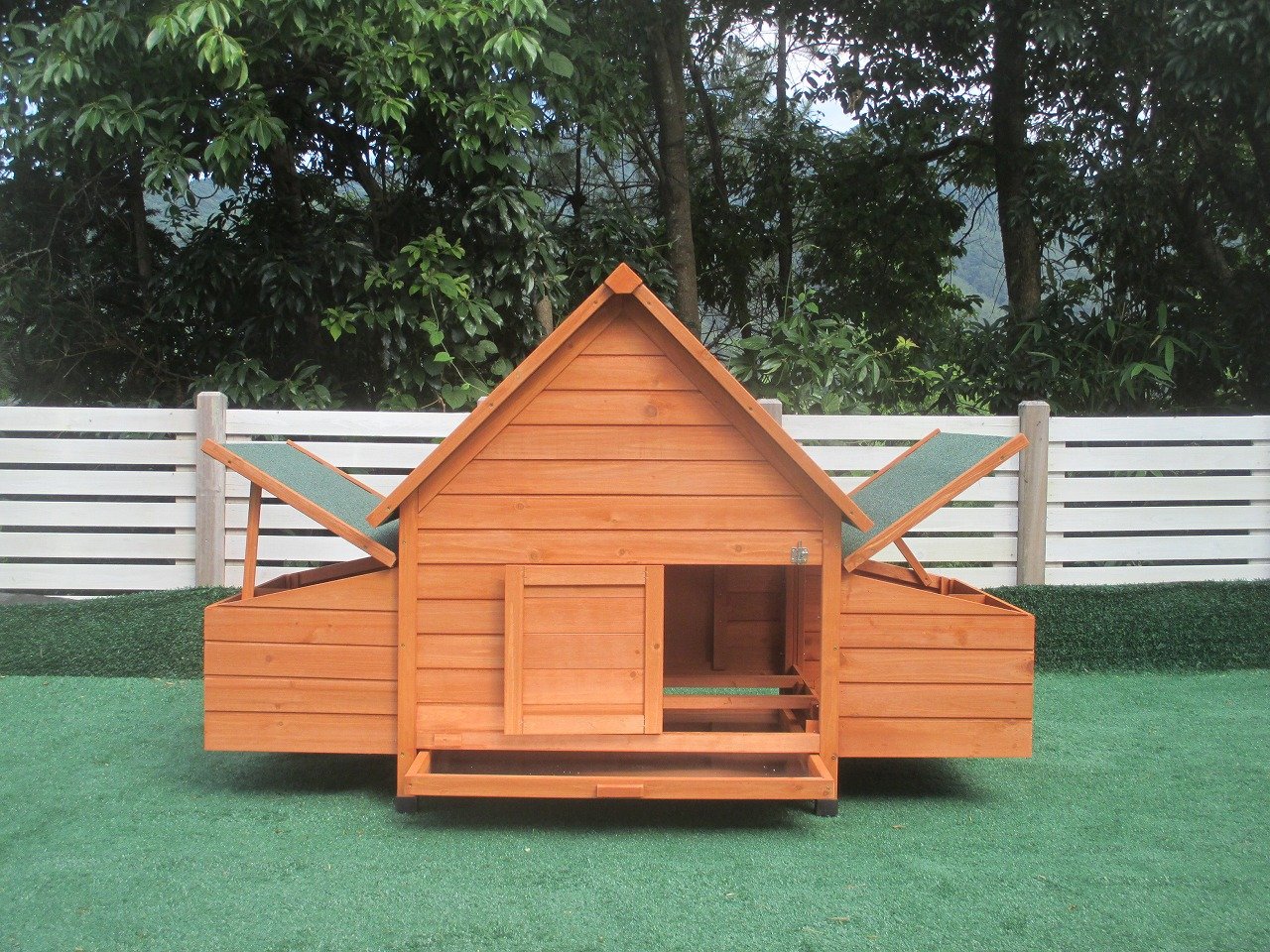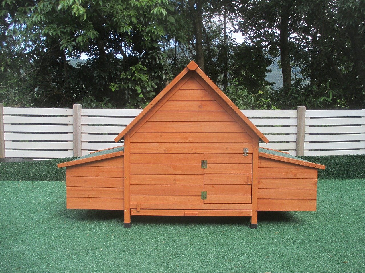Celé vnútro kurníka je dokonale chránené pred dažďom, vetrom a chladom. Drevené nohy sú chránené pred poveternostnými vplyvmi plastovými krytmi. Pred dažďom chráni celý kurník strecha z asfaltového pásu.