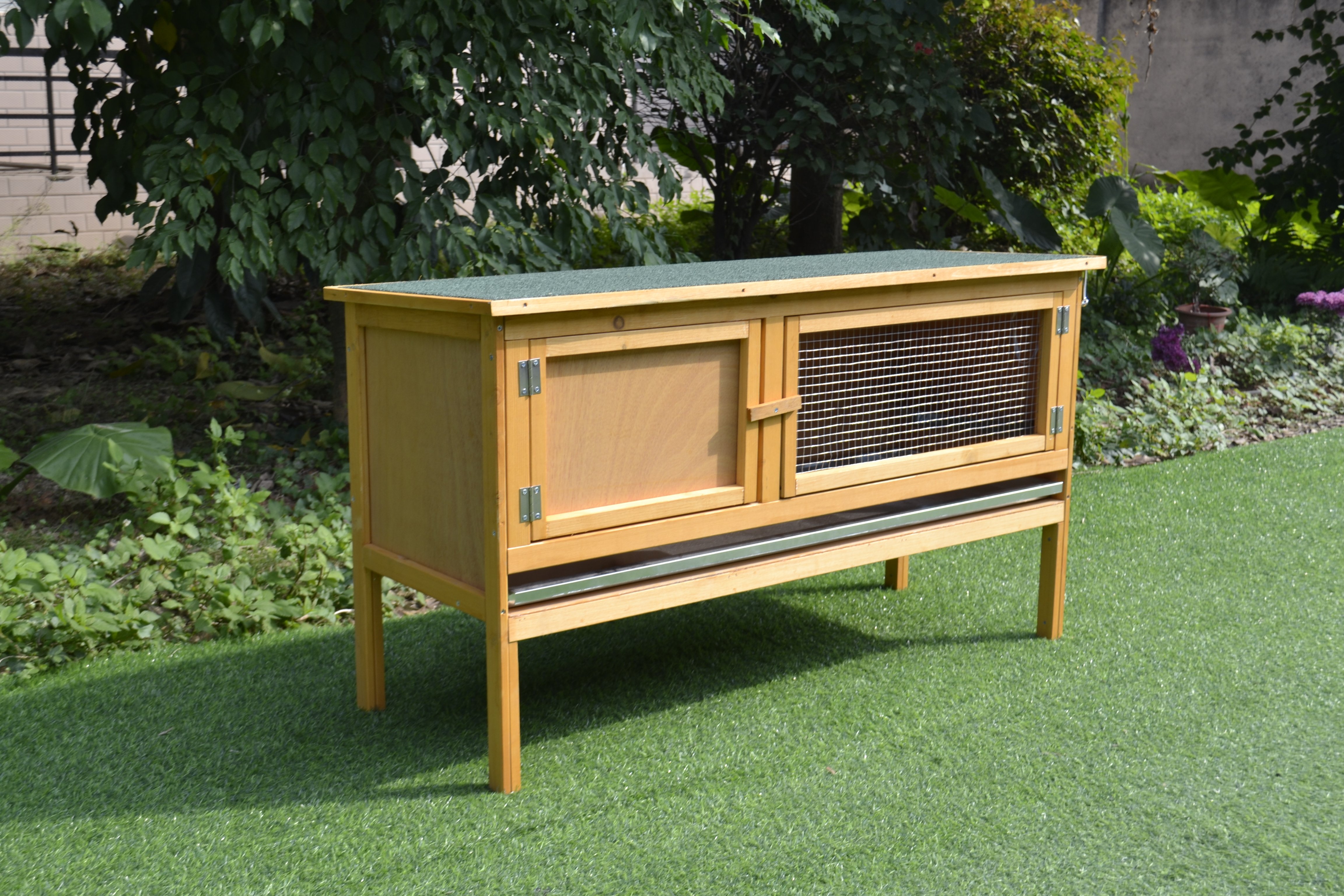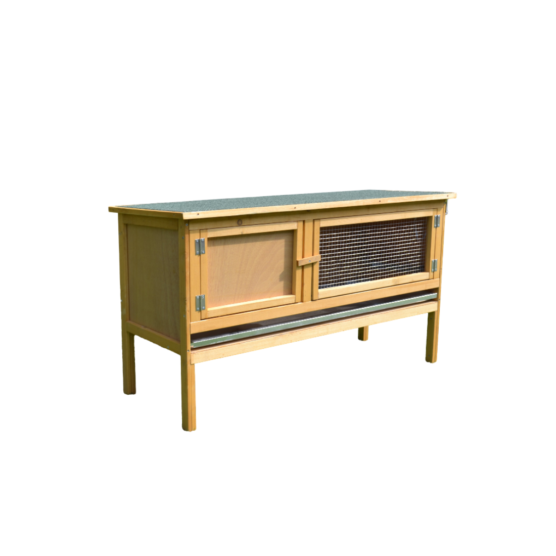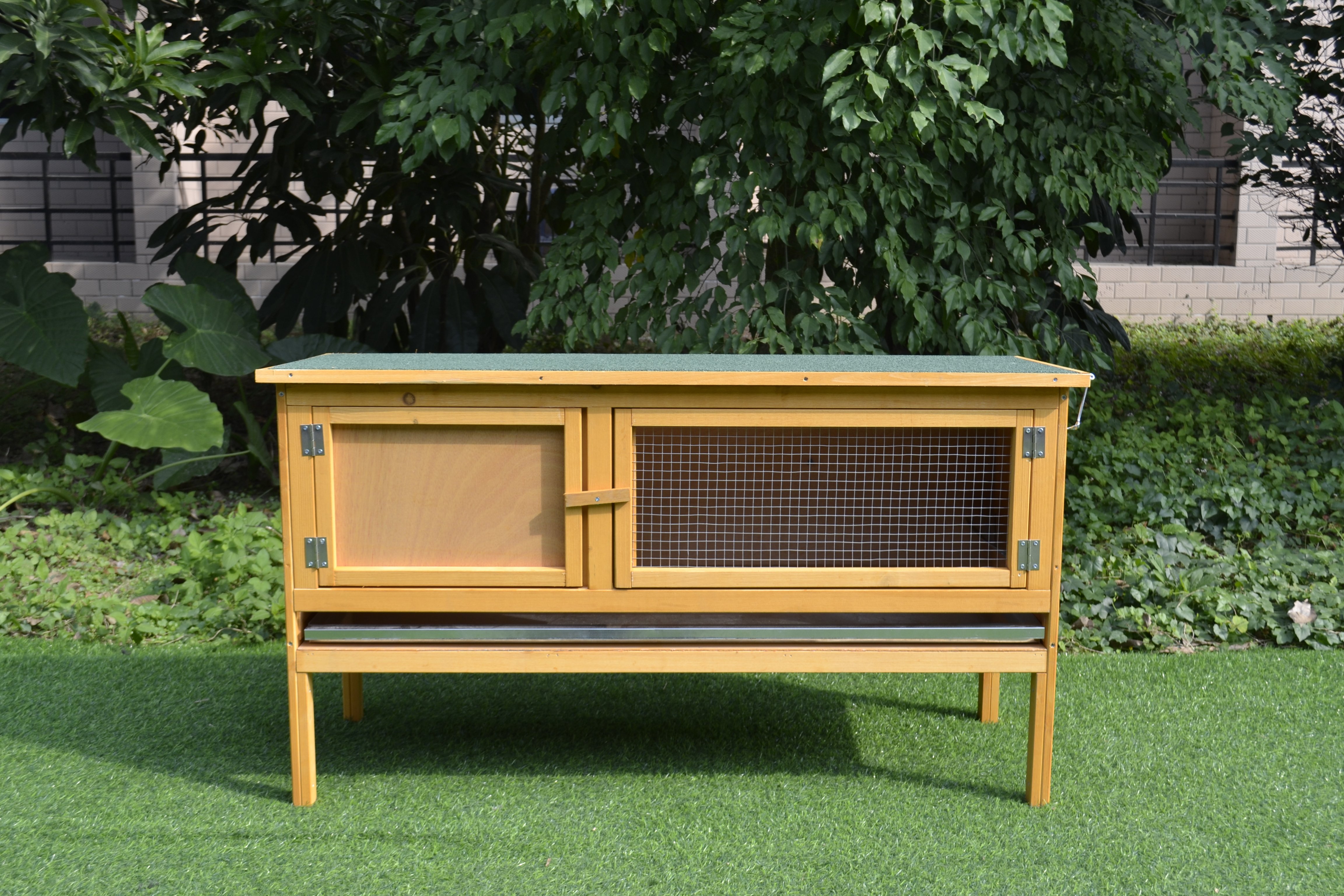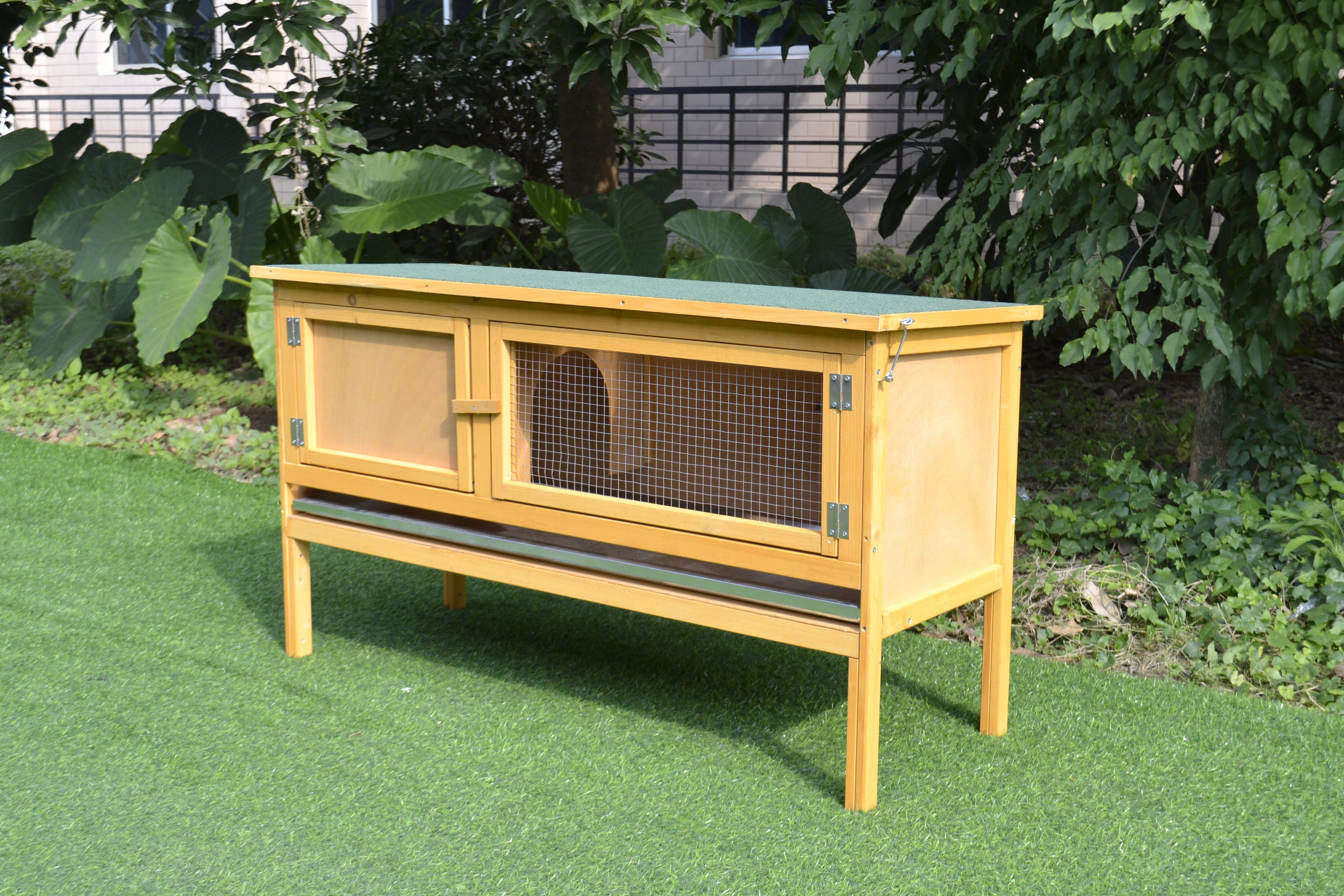 Veľmi robustná, pevne konštruovaná drevená králikáreň, na chov skôr jedného králičieho parťáka. Celodrevená, proti plesni ošetrená konštrukcia zaistí bezpečný domov všetkým vami chovaným ušiakom, navyše vďaka stabilným nôžkam je drevený koterec chránený pred prízemným vlhkom a chladom.
