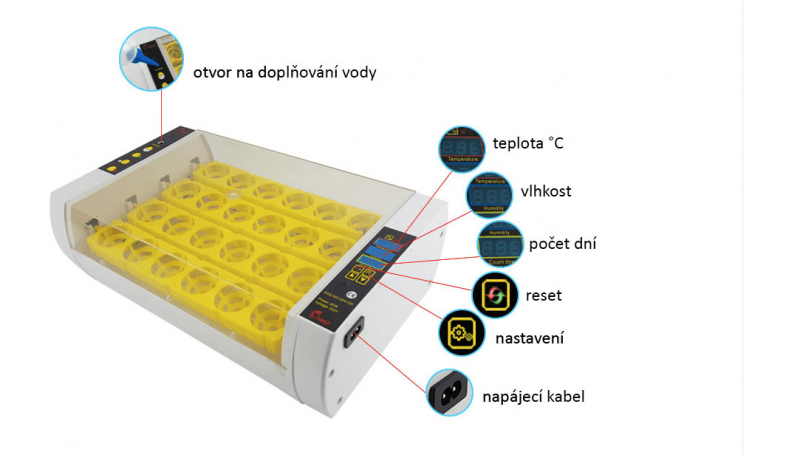 - Funkcie. Automatické riadenie teploty a automatické otáčanie vajec, doliaheň