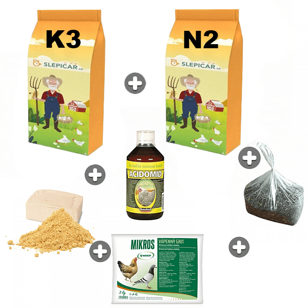 Kŕmny balíček super predstavuje pomyselnú barličku pre začínajúcich chovateľov. Balíček obsahuje základné kŕmne produkty pre úplného začiatočníka, ktorý sa rozhodol pre svoje domáce vajíčka. Vybrali sme pre Vás taký tovar, ktorý patrí do základnej výbavy krmív pre úspešný chov sliepok. A teraz už vám postačí len dobre postavený kurník. Vďaka výhodnému balíčku samozrejme ušetríte nemalý peniaz.
