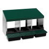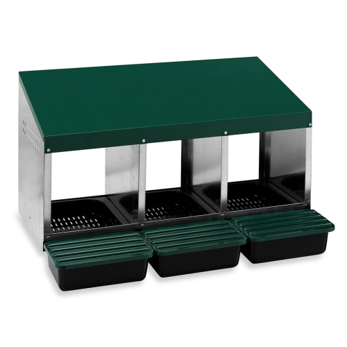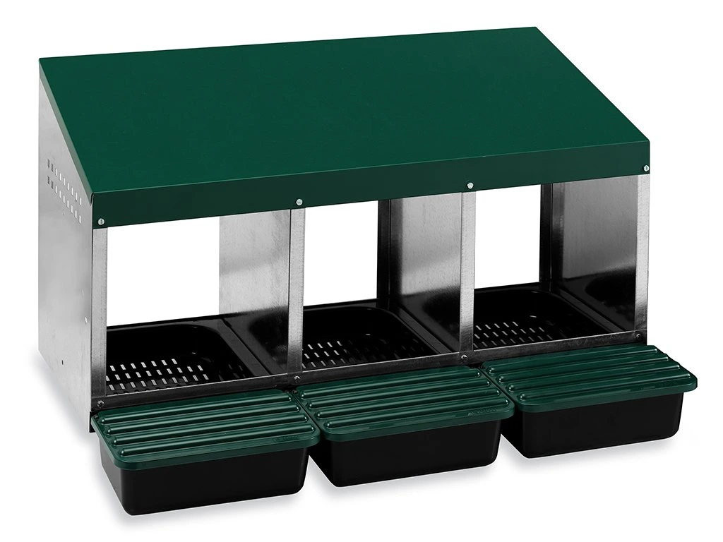 Trojdielne znáškovú hniezdo pre nosnice všetkých plemien. Hniezdo je vyrobené z pozinkovaného plechu, v kombinácii s odolným plastom. Hniezda sú vybavené odklopte pre ľahké vybratie znesených vajec. Vhodné na umiestnenie do stredne veľkých priestorov kurníku.