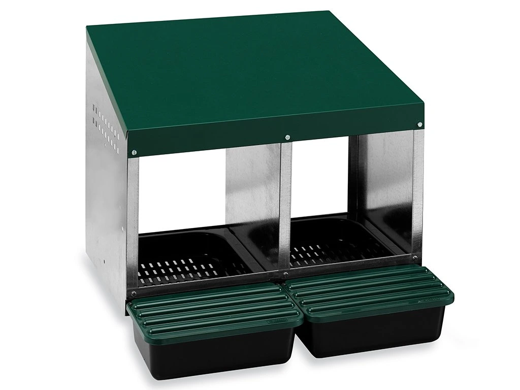 Dvojdielne znáškovú hniezdo pre nosnice všetkých plemien. Hniezdo je vyrobené z pozinkovaného plechu, v kombinácii s odolným plastom. Hniezda sú vybavené odklopte pre ľahké vybratie znesených vajec. Vhodné na umiestnenie aj do menších priestorov kurníku.