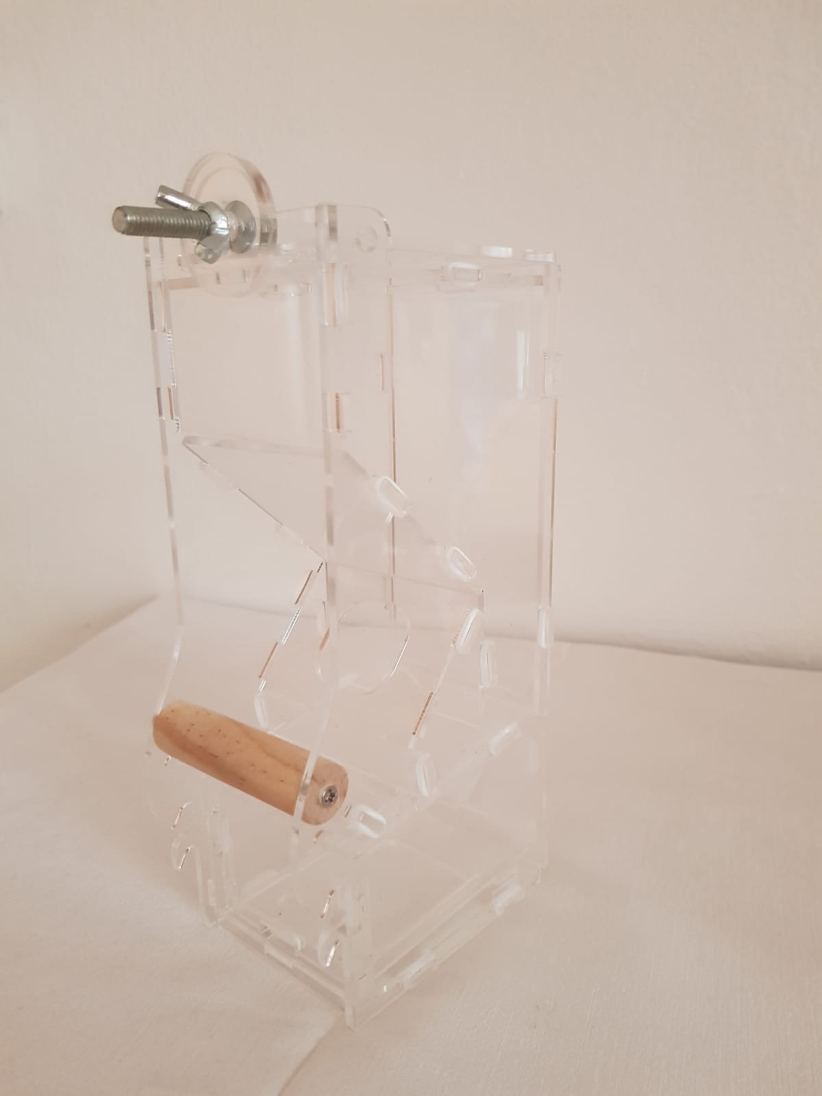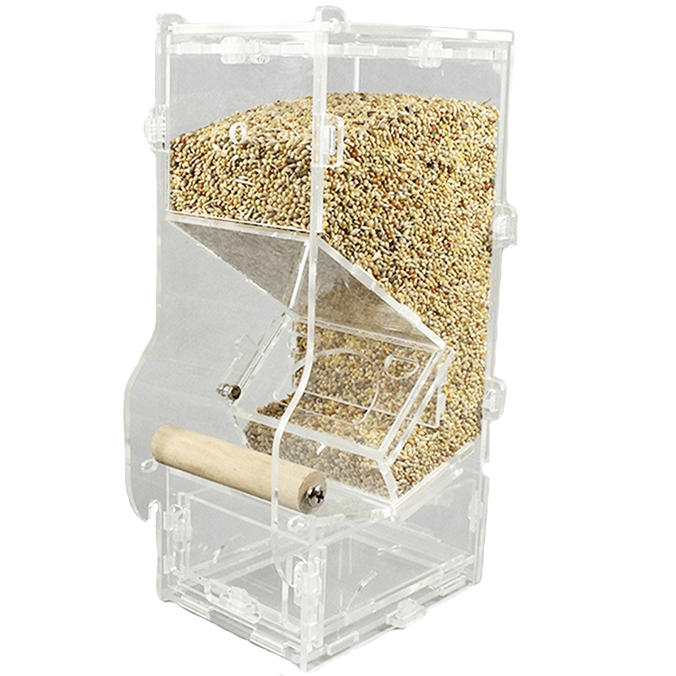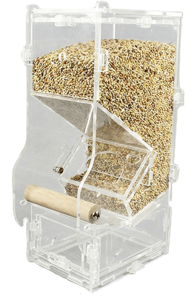 Odklopením vrchného poklopu dosypte krmivo pre vtáctvo do vnútorného bludiska, zasunte zberný kôš a s pomocou závesov, upevnite ku klietke. Vďaka priehľadnosti celého kŕmidla budete mať absolútny prehľad o množstve zjedeného krmiva.