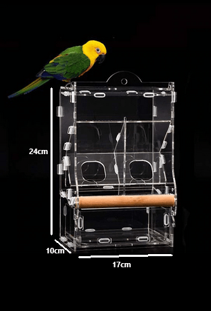 Odklopením vrchného poklopu dosypte krmivo pre vtáctvo do vnútorného bludiska, zasuňte zberný kôš a s pomocou závesov, upevníte ku klietke. Vďaka priehľadnosti celého kŕmidla budete mať absolútny prehľad o množstve vyzobavného krmiva.