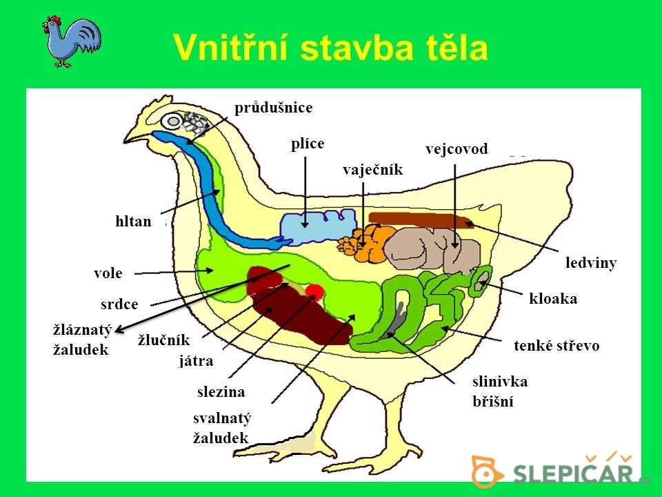- Vývod. Ukončenie kloaky, ktoré môžeme treba nazvať konečníkom, tvorí zároveň koniec zažívacej a pohlavnej sústavy sliepky. Na úplnom konci je potom vajíčko, ktoré aj kloakou prechádza.